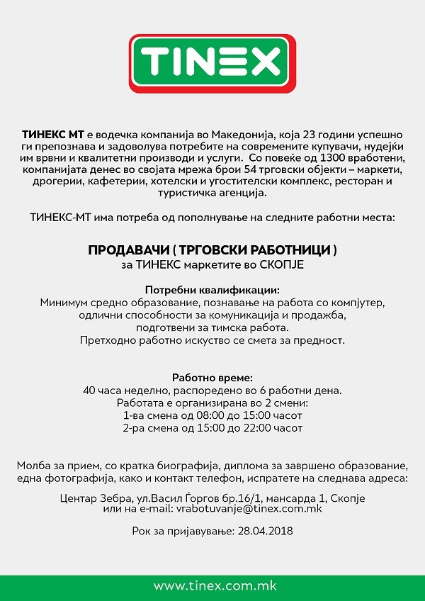 Ланецот на маркети Тинекс има потреба од работници за маркет лоциран во Скопје.