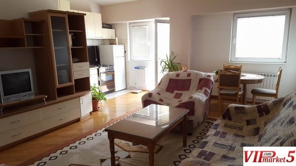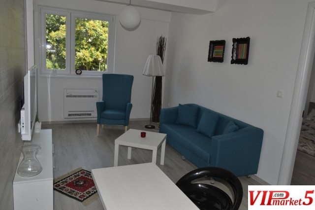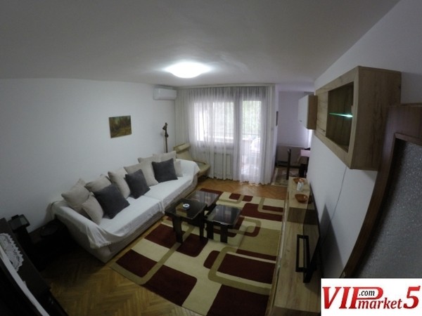 Комплетно наместен, неодамна реновиран стан со површина од 64м2 плус тераса. Терасата има дополнителна површина од 4м2 и е насочена кон југо-исток. Станот е комплетно наместен со речиси потполно нов мебел и опремен со основните технолошки уреди. Располага со дневна, 2 спални соби, купатило, тарпезарија и кујна. Од приложените фотографии кои огласувачот ги понудил може да се забележи дека се работи за естетски одлично опремен стан погоден за три или четиричлено семејство. Цената за месечен закуп не е потенцирана, меѓутоа по слободна проценка истата би била северно од 350 евра, плус режиски трошоци.
