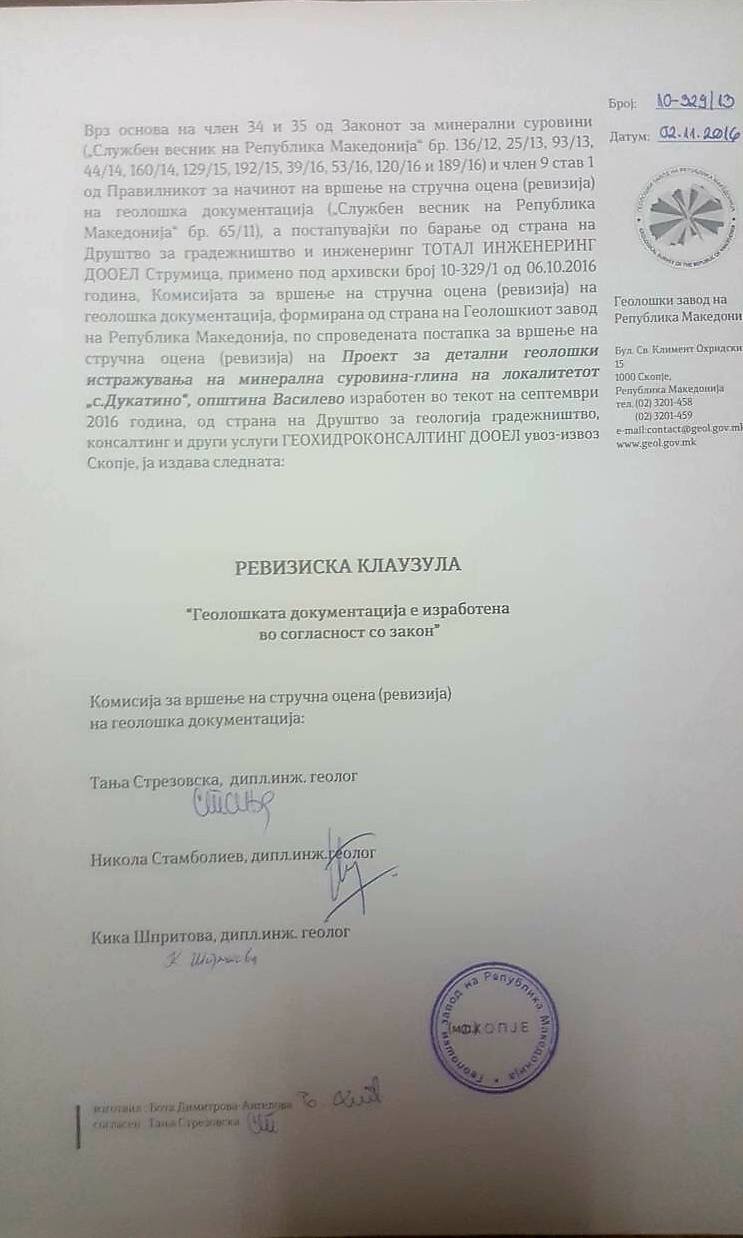 „Договорот со Владата на Република Македонија за детални геолошки истражувања Тотал инженеринг го има потпишано пред три години, односно во 2015 година.Во тоа време,премиер на владата беше Никола Груевски, тогашен претседател токму на ВМРО-ДПМНЕ. Согласно законската постапка, којашто е идетнична за сите, врз основа на тој Договор Тотал инженеринг ја продолжува процедурата која завршува во април 2018 година Имаме проект и Елаборат за извршени геолошки истражувања, имаме Ревизиска клаузула на Проект од страна на Геолошки завод на РМ, се тоа во време кога институциите беа раководени од кадри на ВМРО-ДПМНЕ. Значи исполнети се сите законски и правни регулативи од страна на Тотал инженеринг и затоа е добиена концецијатаоткако се добиени позитивни мислења од сите надлежни институции. Целосно непотребно ВМРО-ДПМНЕ се обидува да ја дефокусира јавноста. Треба да знаат дека се целосно прочитани и да престанат со овие смешни прес конференции“- стои во демантот.