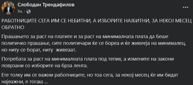 „Прашањето за раст на платите и за раст на минималната плата да беше политичко прашање, сите политичари ќе се бореа и ќе живееја на минималец, но ниту се борат, ниту живеаат. Потребата за раст на минималната плата под тепих, а измените на закони поврзани со изборите на брза лента. Ете толку им се важни работниците, но тоа сега, за некој месец ќе им бидат најважни, е тогаш...“, пишува тој.