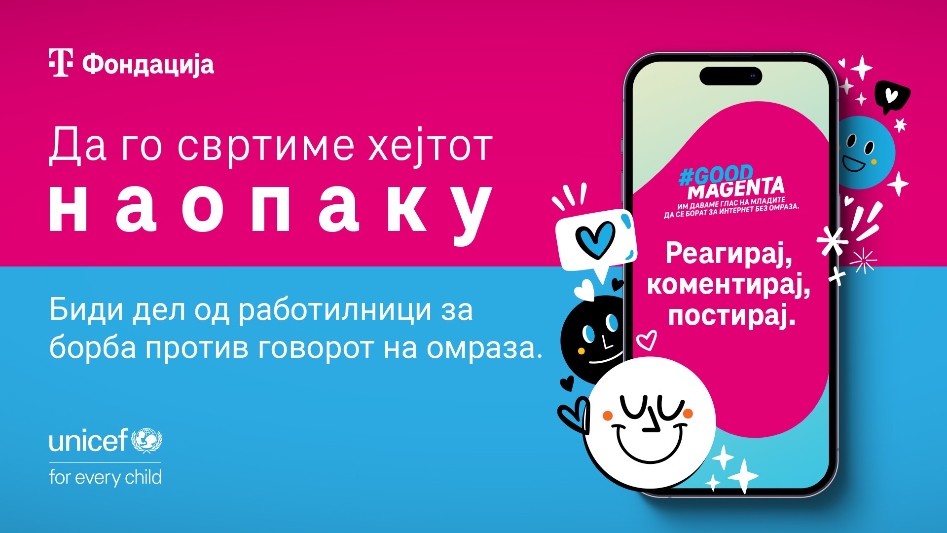 УНИЦЕФ и Фондацијата Телеком за Македонија објавуваат нов отворен повик до децата и младите да се вклучат во комуникациски иницијативи за справување со онлајн насилството и говорот на омраза на интернет. Повикот со наслов: „Заедно за интернет без омраза“ е дел од долгогодишното партнерство помеѓу УНИЦЕФ и Фондацијата Телеком за Македонија чија цел е да ги вклучи децата и младите во справувањето со некои од најголемите предизвици со кои се соочува нивната генерација.