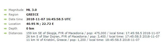 Епицентарот е на 11 км од Кристони во Грција, а потресот бил од 3 степени.