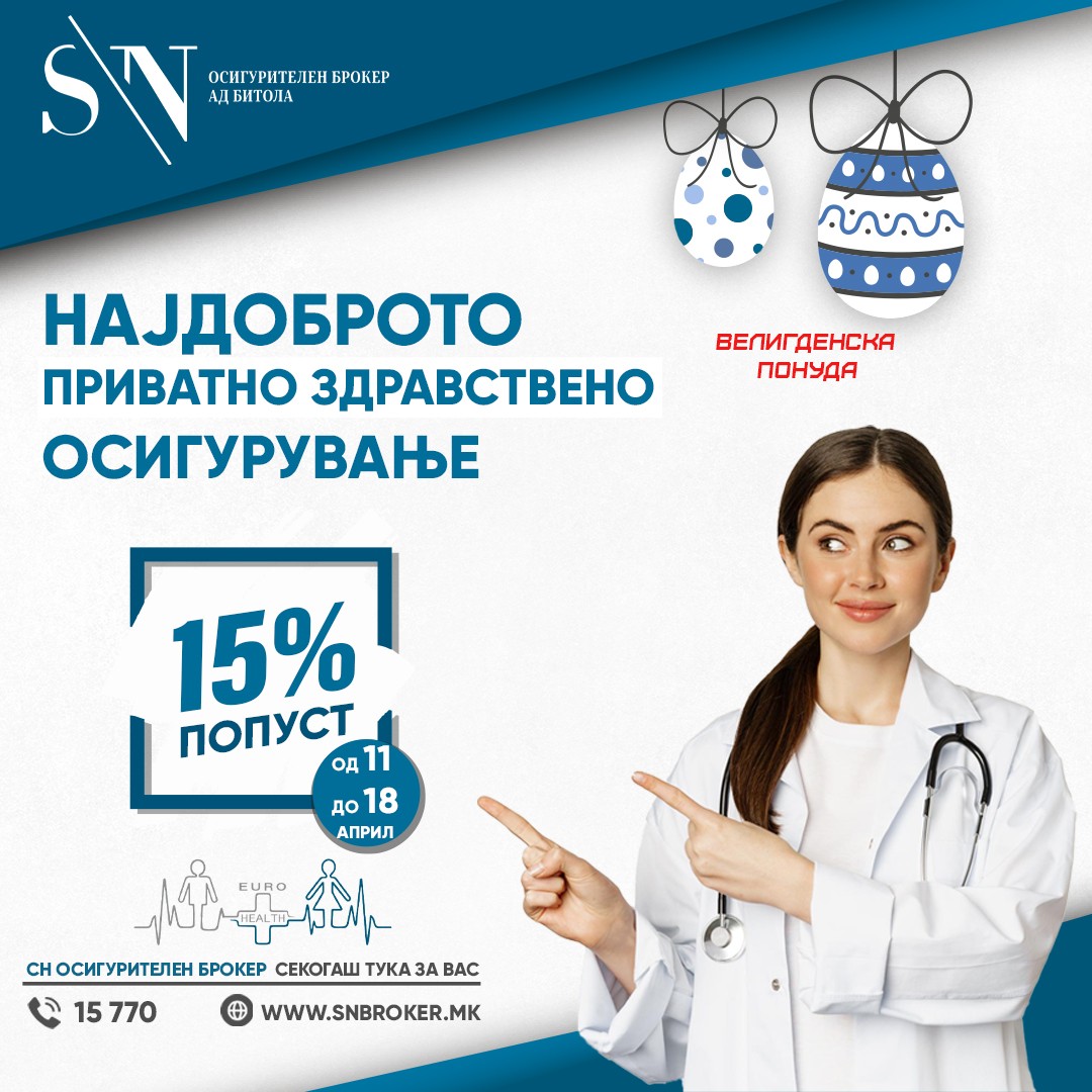 Велигденски попуст од 15 отсто на приватно здравствено осигурување од СН Осигурителен Брокер АД Битола