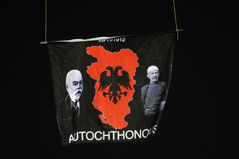 Натпреварот за квалификациите за Евро 2016, кој во Белград го играа Србија и Албанија, е прекинат во 44 минута откако над стадионот се појави беспилотно летало управувано со далечински управувач кое носеше знаме со мапа на Голема Албанија и Мала Србија и натпис 'autochthonous'.