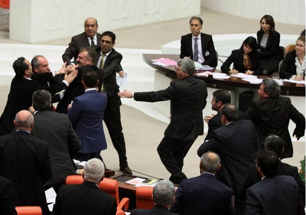 Пет пратеници се повредени во турскиот парламент во кој летале столици, а пратениците се удирале со чеканчето и звоното со коешто се служи претседателот на парламентот за време на заседавањето, јавуваат турските медиуми.