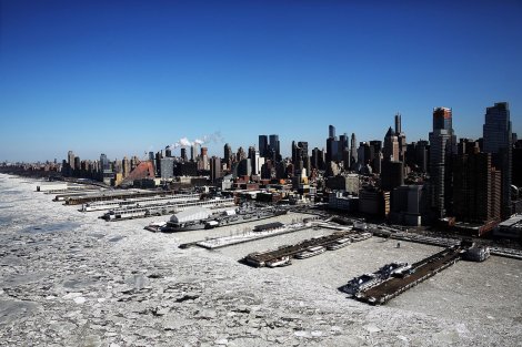 Исклучително ниските температури на Менхетен му дадоа целосно поинаков, досега невиден изглед. Познатата панорама на овој дел од Њујорк отсекогаш им беше привлечна на фотографите, но глетката овој викенд поради мразот и снегот со кој е опкружем станала посебно интересна.