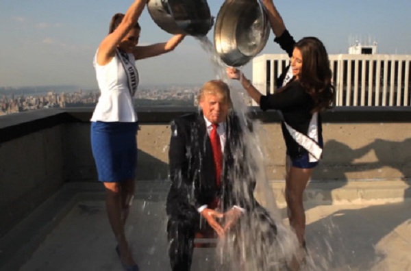 Доналд Трамп се приклучи на акцијата на АЛС „Ice Bucket Challenge“ (ледениот предизвик) и се полеа со ладна кофа вода, но на својствен начин само за него, во придружба на две мисици.