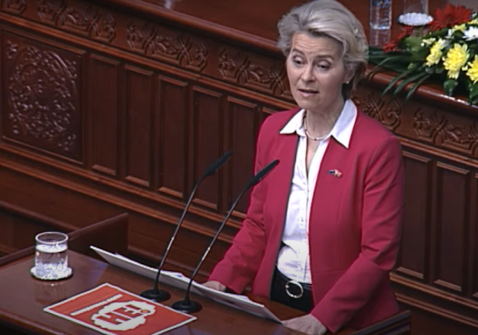 Пратеникот од Левица, Димитир Апасиев со свирежи го прекина говорот на претседателката на Европската комисија(ЕК), Урсула фон дер Лајен и остави транспарент со наслов „Македонија вели НЕ“.