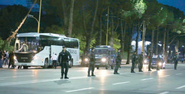 [embed width="700" height="450" ]https://youtu.be/T11UhMObJ8c[/embed]На улиците на Тирана се наоѓаат бројни полициски сили, за да го следат редоследот. Сепак хулиганите пронашле пукнатина во кордонот и го презеле нападот. Автобусот на Србите тргнал кон хотелот, во кој требало да бидат сместени, но по патот бил нападнат со камења од една толпа на хулигани, прозорците на автобусот се искршени. Играчите се во шок по инцидентот.