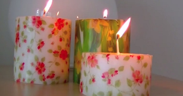 Не секогаш е едноставно да се смисли добар начин за украсување на домот без да потрошите многу пари, но и тоа е можно. Ви донесуваме интересна идеја на украсување на свеќи. Потребна ви е дебела обична восочна свеќа, украсна салфета, пегла и ножици.