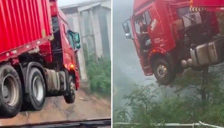 Во Кина, разорните поплави предизвикаа колапс на вијадукт, оставајќи камион да виси буквално над бездна. Возачот сепак успеал да го сопре возилото токму пред да падне.
