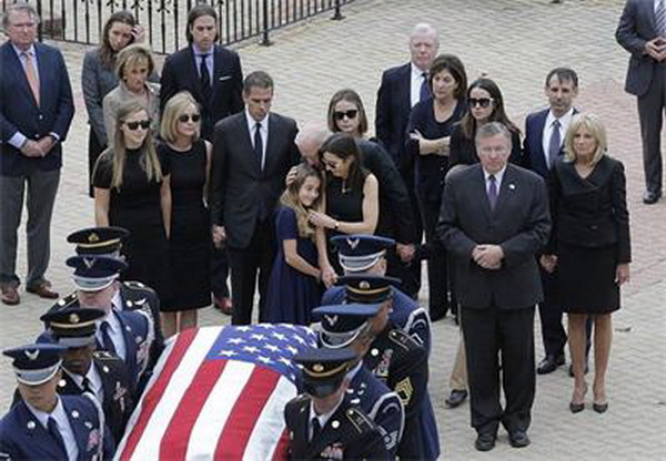 Богослужба се одржа во главниот град на државата Делавер Довер. Бајден се обидуваше да ги утеши двете мали деца на Бо и неговата сопруга Хали. Д-р Џил Бајден - сопругата на потпретседателот, ја смируваат 11-годишната Натали, додека Бајден постариот го надгледува 9-годишниот внук Хантер, додека церемонијата со ковчегот минуваше низ улиците на градот.