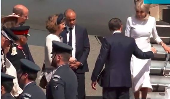 Двојката слетала со приватен авион во Кралската воздухопловна база Нортхолт, каде што ги пречекале принцот Вилијам и принцезата Кејт Мидлтон. Додека се симнувале по скалите, Макрон ја испружил раката за да ѝ помогне на сопругата, но Брижит ладно го одбила.