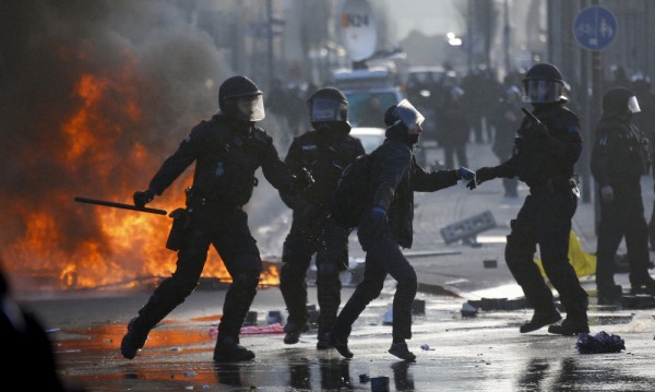 (ВИДЕО ВО ЖИВО) После судирот пред седиштето на ЕЦБ, запалени полициски и приватни возила, 500 лица приведени