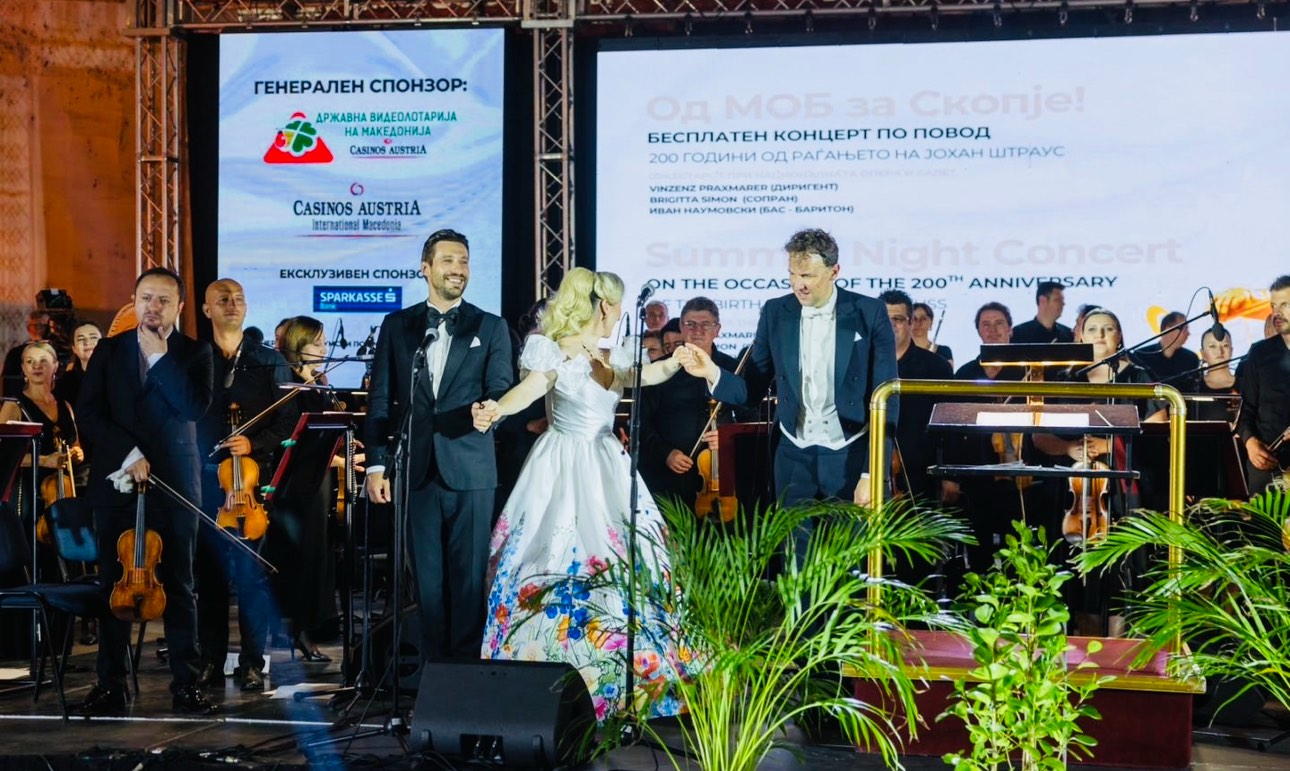 Ова значајно културно случување, организирано од Амбасадата на Република Австрија во Скопје, се одржа во саботата на 5 јули, под отворено небо пред Националната опера и балет. Во вечер исполнета со музика, оркестарот на МОБ под диригентската палка на Винсенз Праксмарер и врвните солисти Бригита Симон и Иван Наумовски, ѝ приредија на публиката вистинско музичко доживување – патување низ најпознатите валцери, маршеви и арии на Штраус.