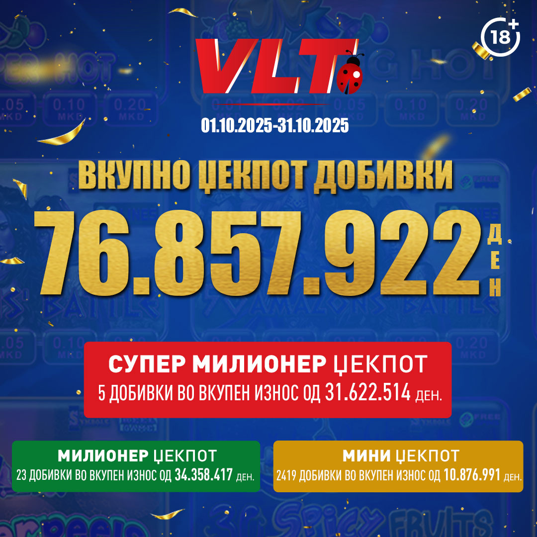Октомври уште еднаш покажа дека среќата е со ВЛТ. Видеолотарија Касинос Австрија им исплати фантастични 76.857.922денари (околу 1.250.000 евра) на своите играчи на ВЛТ терминалите ширум Македонија во перидот од 01.101.2025 до 31.10.2025. Овие бројки се убав доказ за илјадници нови среќни приказни!
