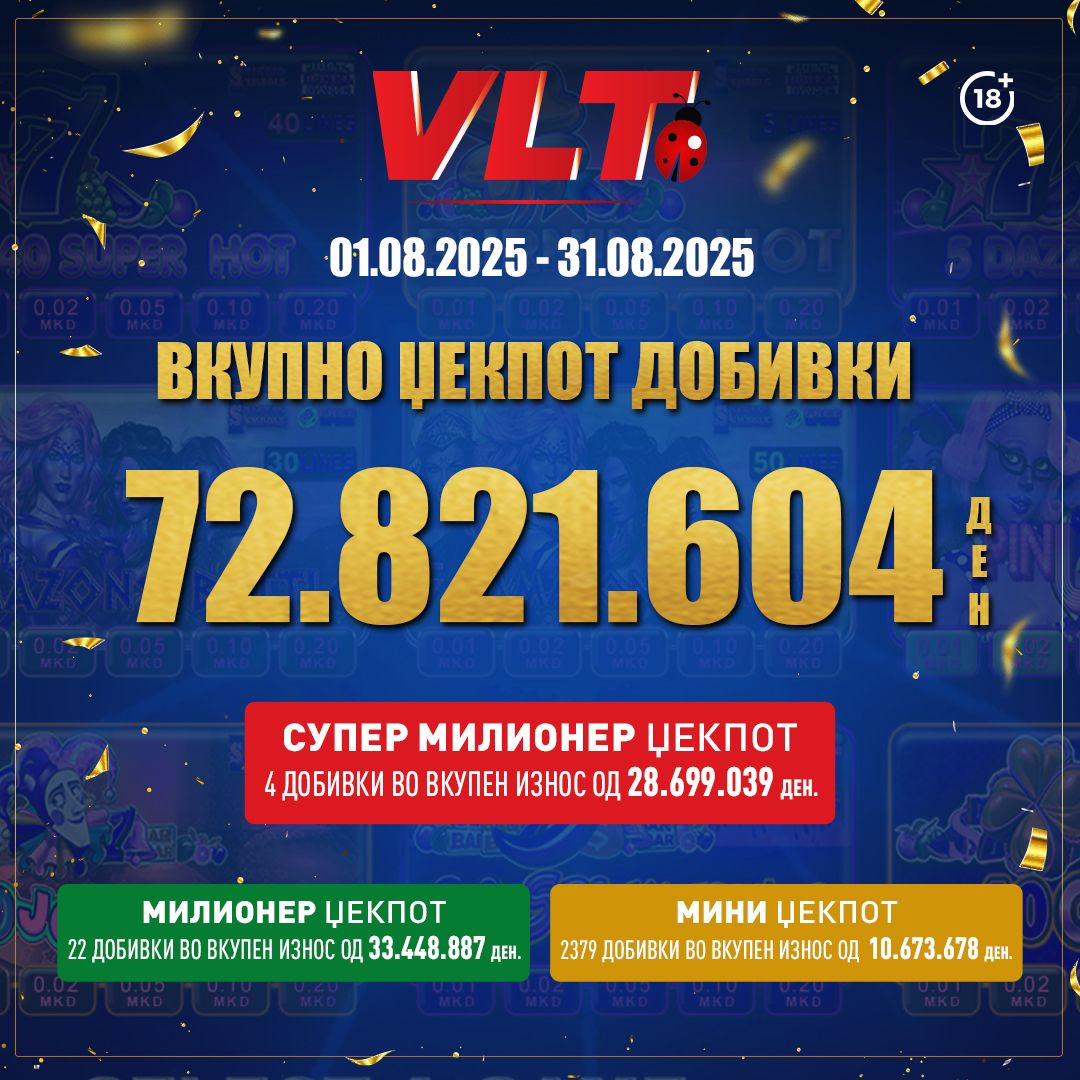 Август 2025 ќе остане запаметен како месец на рекорди! Видеолотарија Касинос Австрија им исплати фантастични 72.821.604 денари (околу 1.200.000 евра) на своите играчи на ВЛТ терминалите ширум Македонија. Овие бројки не се само статистика – тие претставуваат илјадници нови среќни приказни!