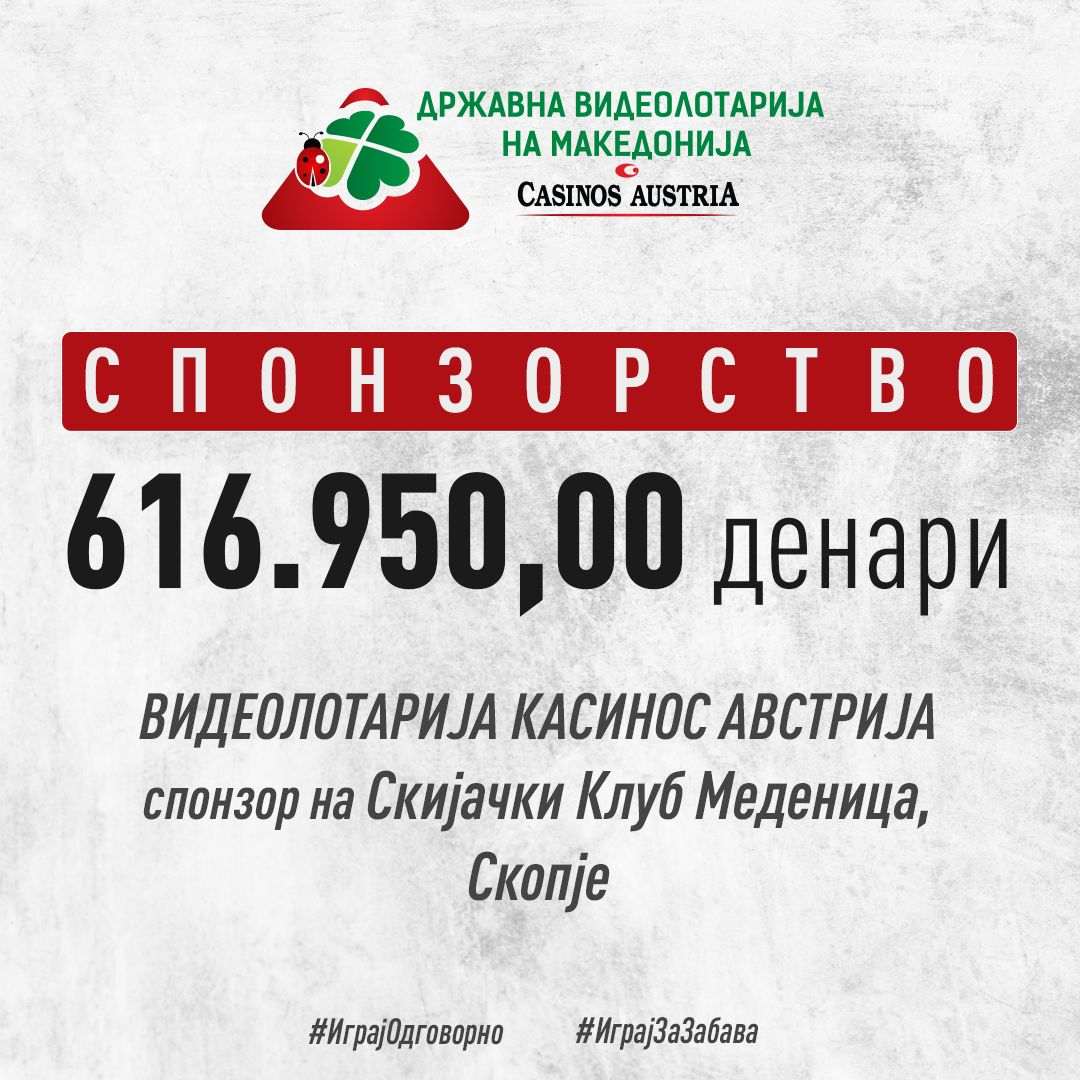 Видеолотарија Касинос Австрија продолжува да биде пријател на спортот. Под слоганот Играј со најдобрите, обезбедивме спонзорство за скијачкиот клуб Меденица во вредност од 616.950,00 денари. Средствата од спонзорството се бидат наменети за помагање и поддршка на кариерата на македонските алпски скијачи Мирко Лазарески и Дардан Дехари.