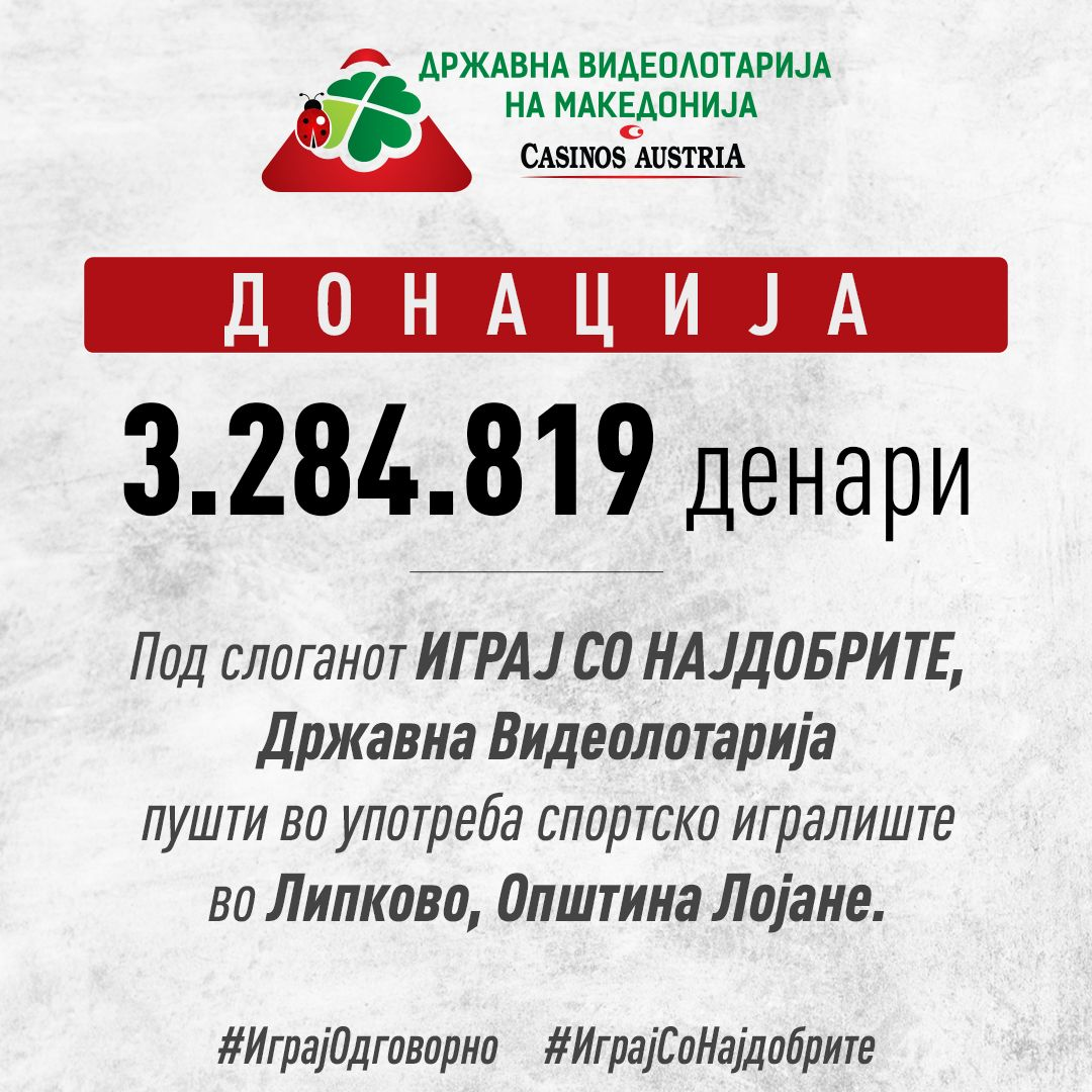 Под слоганот ИГРАЈ СО НАЈДОБРИТЕ, Видеолотарија Касинос Австрија продолжува со амбициозниот проект за повеќенаменски и спортски игралишта низ целата земја. По реконструираните ракометни игралишта во Свети Николе, Битола и Гевгелија, пуштено е во функција и мултифункционалното игралиште во Општина Липково.