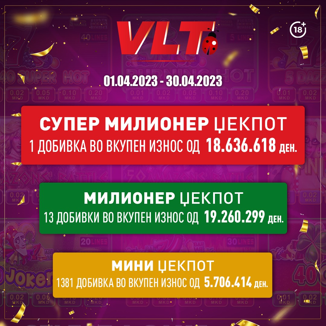 И април се покажа како среќен месец за играчите на видеолотариските терминали. Во текот на овој месец, Видеолотарија им исплати на играчите фантастичнa сума од вкупно 43.603.331,00денари за добивки.