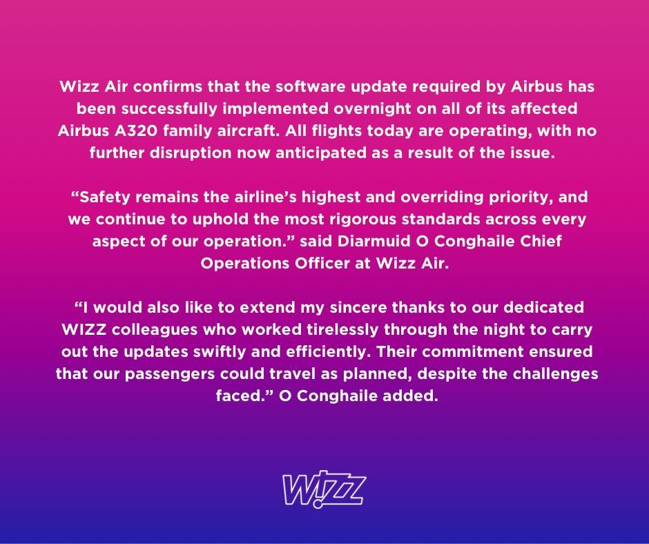 Авиокомпанијата Виз Ер потврдува дека ажурирањето на софтверот што го бараше Ербас беше успешно имплементирано за сите авиони Ербас А320. Додаваат дека сите летови денеска се во тек, без да се очекуваат понатамошни прекини како резултат на проблемот.