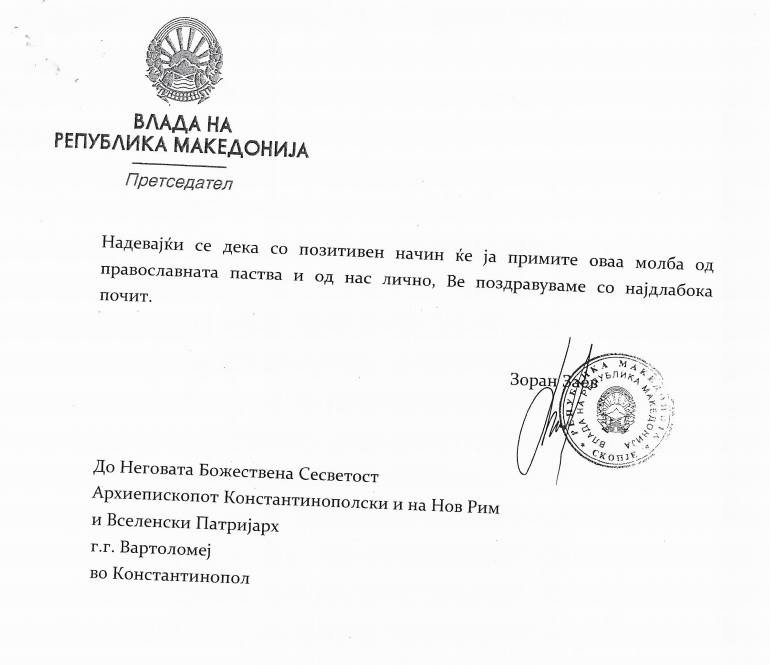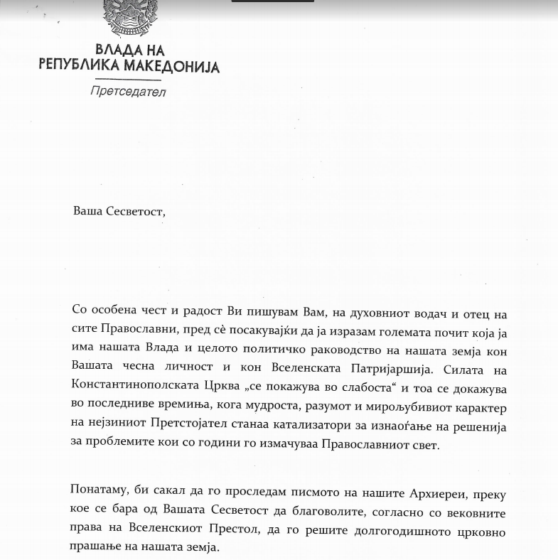 Владата го објави писмото испратено до Вселенскиот Патријарх