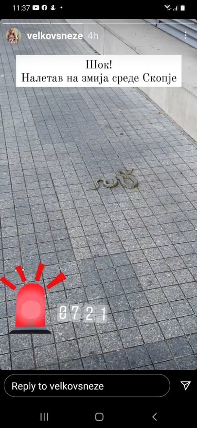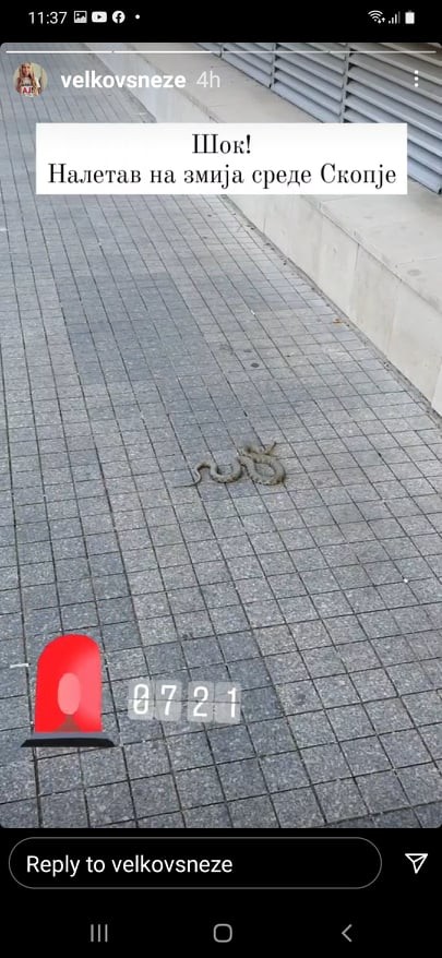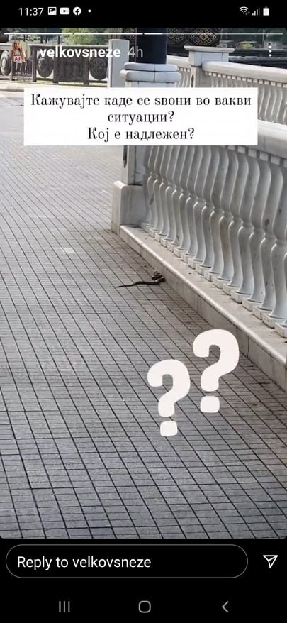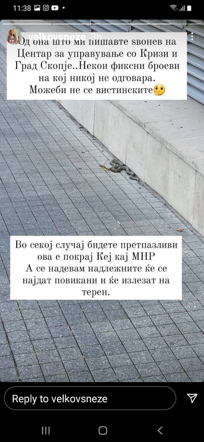 Корисничката на инстаграм се интересирала каде може да ја пријави змијата, а откако било советувано да се јави во Центарот за Управување со кризи и во Град Скопје, таа се обидела да воспостави телефонски контакт, бидејќи на фиксните телефони што ги имаат ставено на своите веб страници овие две институции, никој не одговарал.