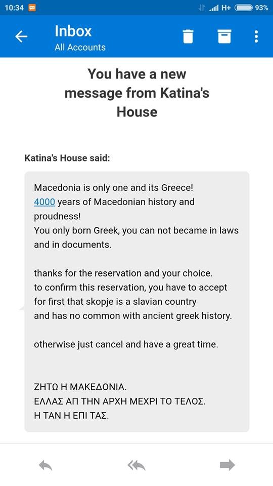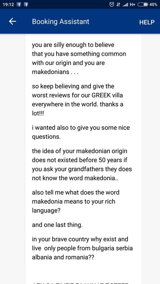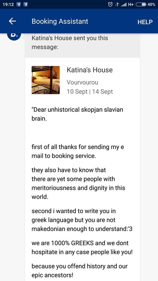 Таа бара booking да ги заштити корисниците од вакви непријатни ситуации. Во преписка со грчките газди објавена на социјалните мрежи тие одговараат дека се Грци, а Македонија е една и е грчка. Грците го негираат постоењето на земјата, но и наведуваат дека според нив во оваа земја живеат Бугари, Албанци, Срби, Романци. Се работи за вилата Katinа's house во Вурвуру на вториот крак.