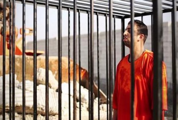 На видеото се гледа некој за кој милитантите од ИС рекле дека е заробениот пилот Муат ал Касесбех како го голта оган додека стои во внатрешноста на метален кафез.