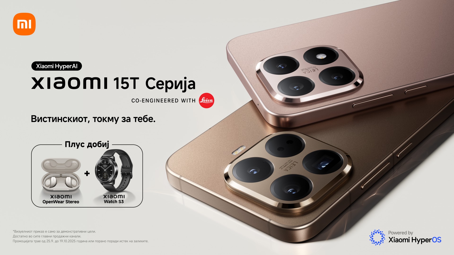 Во периодот од 25 септември до 19 октомври, со купување на моделот Xiaomi 15T или Xiaomi 15T Pro, купувачите ќе добијат на подарок Xiaomi Watch S3 и Xiaomi OpenWear Stereo. Оваа акција овозможува со новиот телефон веднаш да ги испробате и дополнителните уреди кои го надополнуваат екосистемот на Xiaomi.