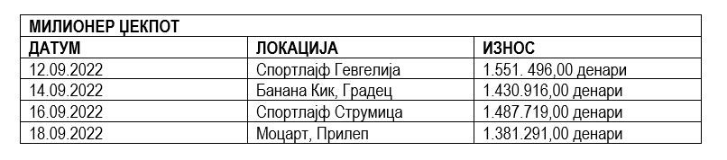 Измина уште една супер среќна недела од септември, полна со многу добивки кои овозможија кај играчите на ВИДЕОЛОТАРИЈА КАСИНОС АВСТРИЈА да легнат вкупно 8.087,356,00 денари.