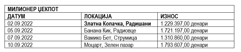 Најголемата добивка оваа недела е најпосакуваната. СУПЕР МИЛИОНЕР ЏЕКПОТОТ вреден 11.343.368,00 денари е освоен на 08.09.2022 на видеолотариските терминали во Моцарт Чаир.
