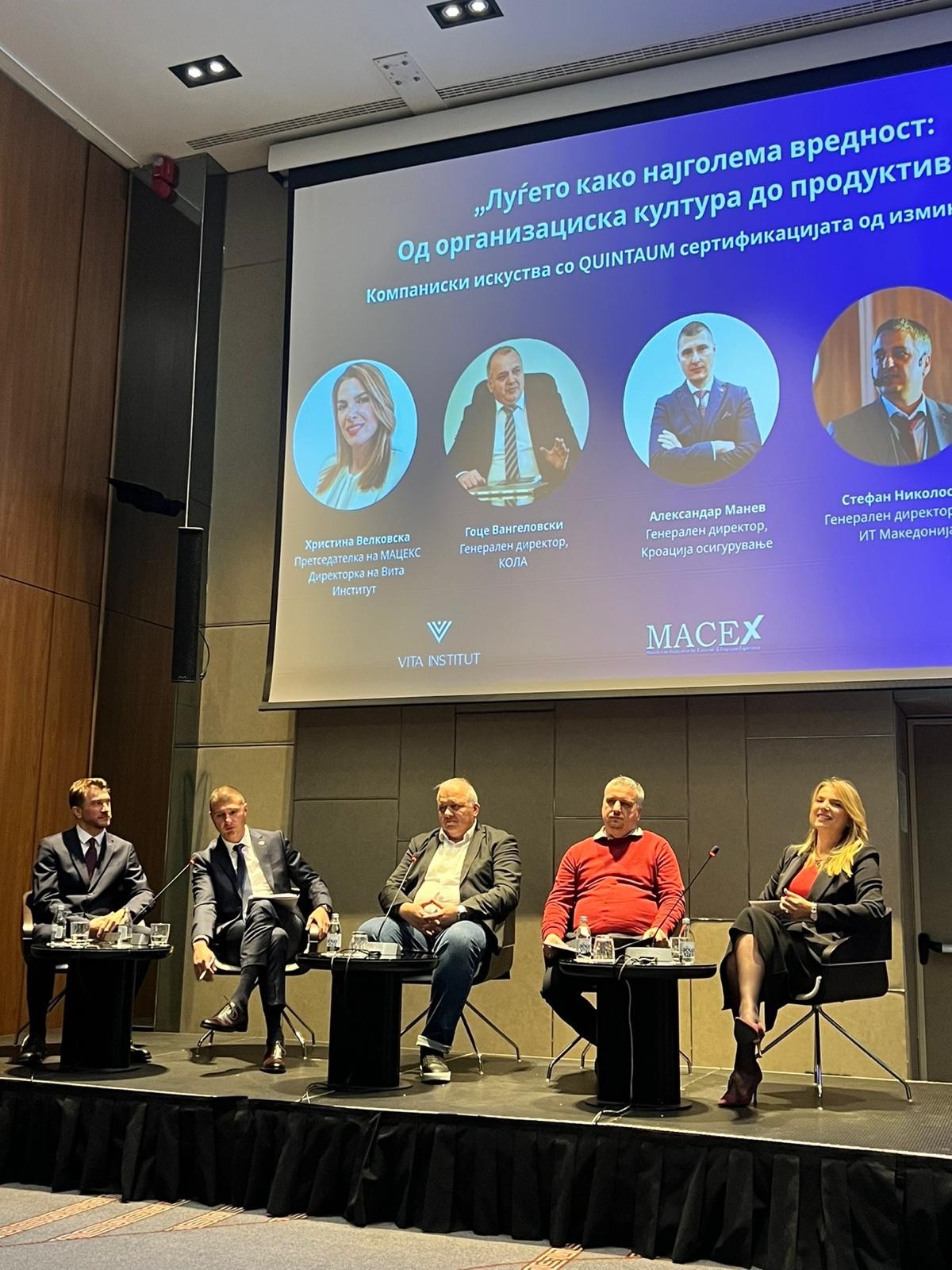Во фокус на настанот беше панел-дискусијата со дел од компаниите досегашни корисници на Quintaum дијагностиката и добитници на сертификатите за извонредни искуства на вработените од претходните години. На панел дискусијата се обратија генералните директори: Гоце Вангеловски, КОЛА, Александар Манев, КРОАЦИЈА ОСИГУРУВАЊЕ, Стефан Николоски РСМ ИТ Македонија и Илија Јованоски FLEDGEWORKS за нивните реални искуства, на тема: Луѓето како најголема вредност: Од организациска култура кон продуктивност.