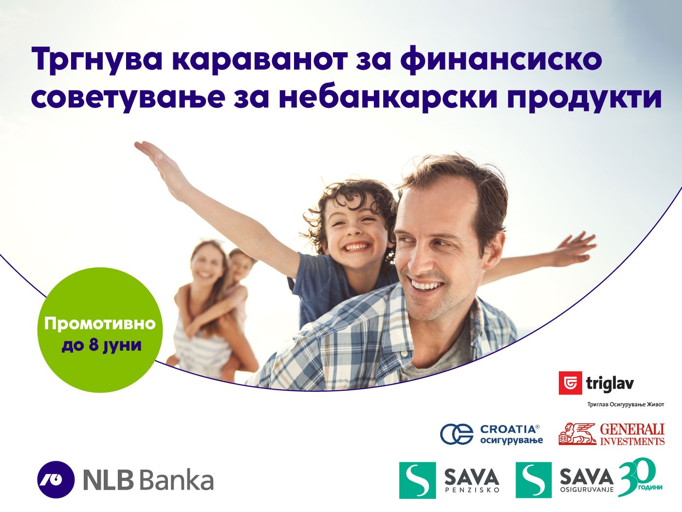 Од денеска, 8 мај, започнува едномесечниот караван на НЛБ Банка за финансиско советување за небанкарски продукти, кој Банката, трета година по ред, го организира во соработка со своите партнери Сава Осигурување, Триглав Осигурување Живот, Кроација Осигурување Живот, Генерали Инвестмент и Сава Пензиско Друштво.