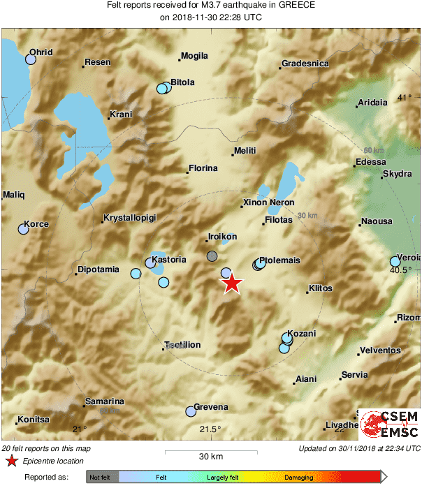 На 28 минути по 23 часот, во близина на границата помеѓу Македонија и Грција е регистриран земјотрес со магнитуда од 3,7 степени по рихтер на длабочина од 2 км.