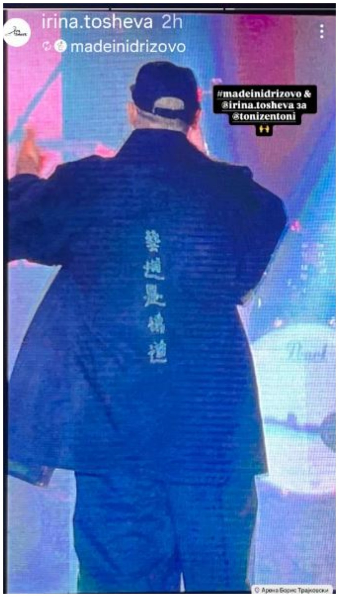 „Овој пост го посветувам на Ирина Тошева и Made in Idrizovo. Со Ирина Тошева се запознавме во затворот Идризово, јас имав настап во машкото одделение, а она, во женското одделение има кројачка работилница, создадена со донации од добрата волја на граѓаните, каде што ги обучува жените кои отслужуваат казна затвор, да шијат, везат и кројат. На овој начин жените се ресоцијализираат и го поминуваат времето низ креативен процес. Јас бев восхитен од тоа и им реков дека сакам од нив едно кимоно за концертот. Епа, ова е тоа ЗЕН кимоно, дами и господа — сто посто направено во Македонија. Вечно благодарен за ова.“