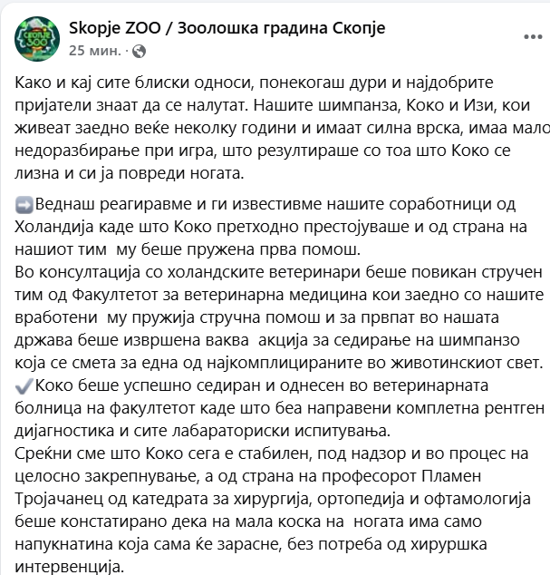 Од Зоолошката градина Скопје информираат дека мало недоразбирање меѓу две шимпанза довело до тоа едното да се лизне и да си ја повреди ногата.