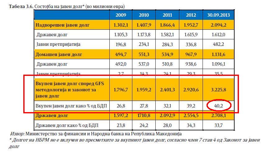 “Ако на ова ги додадеме задолжувањата во последните три месеци од 2013, тој изнесува 3 милијарди и 390 милиони евра и е 42% од БДП. При тоа, ако БДП го пресметуваме по методот на Народна Банка, кој е и единствено исправен, а Ставревски не сака да го примени, вкупниот јавен долг изнесува 44% од БДП“, изјави Кире Наумов од СДСМ.Наумов смета дека со овој документ во кој долгот е пресметан според Законот за јавен долг и по методологијата GFS (Government Finance Statistics), Владата признава дека со години го прикрива јавниот долг на државата и дека не се почитувале законите и меѓународните методологии.