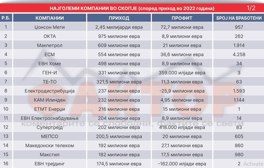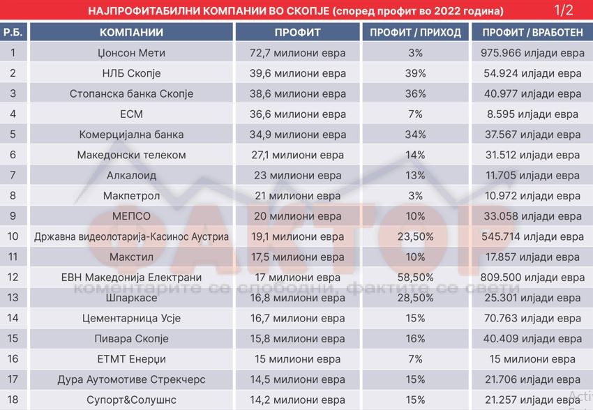 Скопската филијала на мултинационалната корпорација „Џонсон Мети“ останува убедливо најголема компанија во Македонија со седиште во Скопје. По двата критериуми. Приход и профит. Само заради создавање на контекст „Џонсон Мети“ има приход што е безмалку тројно поголем од второрангираната ОКТА. Неговиот приход лани изнесувала 2,45 милијарди евра. Од аспект на профитот исто така оваа компанија доминира. „Џонсон Мети“ лани е најпрофитабилната компанија со добивка од 72,7 милиони евра. Тоа е за 83 отсто повеќе од второрангираната компанија – НЛБ Банка.