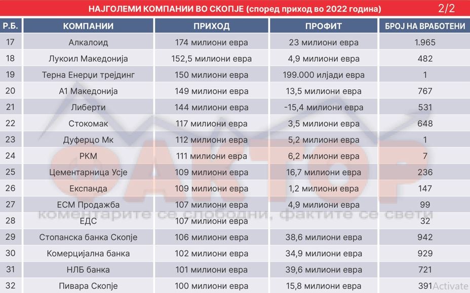 Ранг листа: „Клуб 100 на Фактор.мк“: Кои се најмоќните скопски компании, прават дневен промет од најмалку три милиони евра?