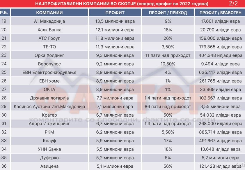Иако струјата, дизелот и мазутот го водеа главниот збор кај приходите не излегоа доволно силни за да направат промена кај профитите. Меѓу најпрофитабилни компании во Скопје и лани беа најголемите банки. Тие се покажаа отпорни на кризата со енергенси откако претходно се покажаа како отпорни и на корона кризата.