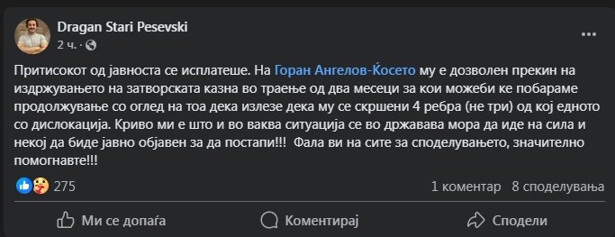 „Притисокот од јавноста се исплатеше. На Горан Ангелов-Ќосето му е дозволен прекин на издржувањето на затворската казна во траење од два месеци за кои можеби ќе побараме продолжување со оглед на тоа дека излезе дека му се скршени 4 ребра (не три) од кои едно со дислокација. Криво ми е што и во ваква ситуација се во државава мора да иде на сила и некој да биде јавно објавен за да постапи! Фала ви на сите за споделувањето, значително помогнавте!“, објави неговиот адвокат Драган Пешевски.
