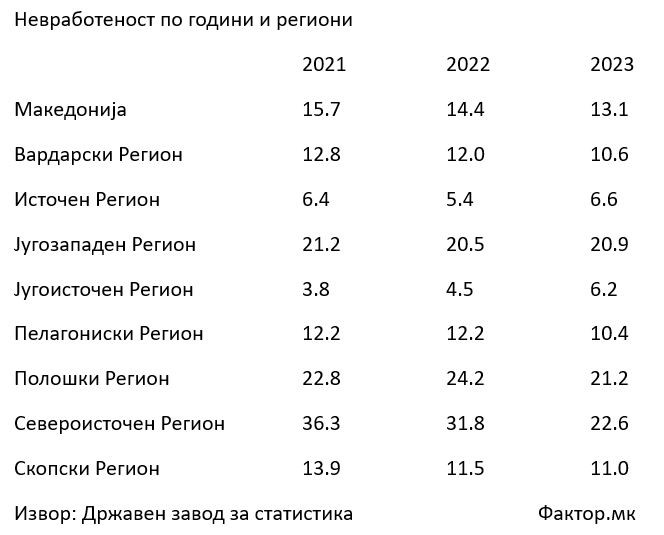 Што се однесува пак до Полошкиот регион, таму невработеноста во 2021 била 22,8 проценти, па пораснала на 24,2 отсто во 2022 година, за повторно да се намали во текот на минатата година.