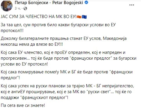 „Доколку билатералните прашања станат ЕУ услов, Македонија никогаш нема да влезе во ЕУ!!! Кој сака ЕУ членство, кој е проЕУ определен, кој е напреден и прогресивен… тој ќе биде против „француски предлог” за бугарски услови во ЕУ протокол! Кој сака помирување помеѓу МК и БГ ќе биде против „француски предлог”! Кој сака успех на руски планови за трајно МК - БГ непријателство, кој е антиЕУ проширување, кој е за МК во „руски свет”… тој ќе го поддржи „францускиот предлог”!, наведува Богојески.