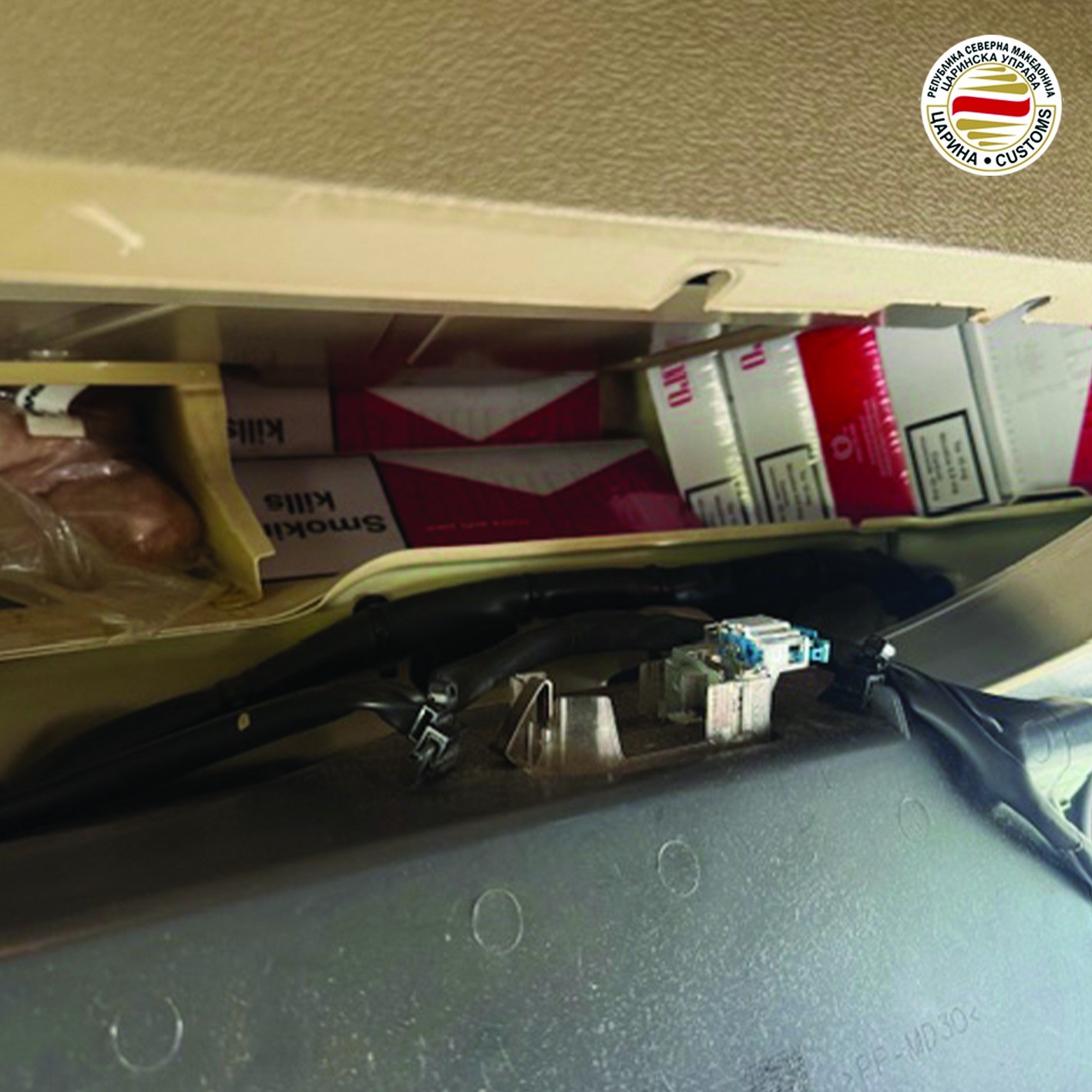 На граничниот премин Богородица од страна на Службата за мобилни скенери во фабричка празнина во горниот дел на кабината на влекач со македонски регистарски таблички откриени се 9 штеки цигари без акцизни маркички.