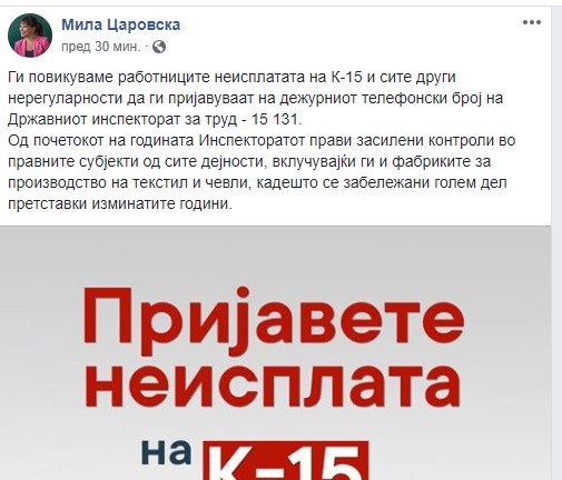 „Ги повикуваме работниците неисплатата на К-15 и сите други нерегуларности да ги пријавуваат на дежурниот телефонски број на Државниот инспекторат за труд - 15 131.