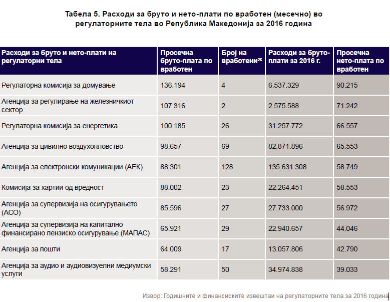 Според податоци од годишните извештаи на овие тела за предминатата година, кои ги собра „Фондацијата за демократија на Вестиминистер, Македонија“, десет регулаторни тела и агенциии во 2016 година за плати на вработените им исплатиле вкупно 374 милиони денари или над шест милиони евра. Во овие десет тела таа година биле вработени вкупно 375 луѓе, што значи дека секој од нив земал брути плата од околу еден милион денари.