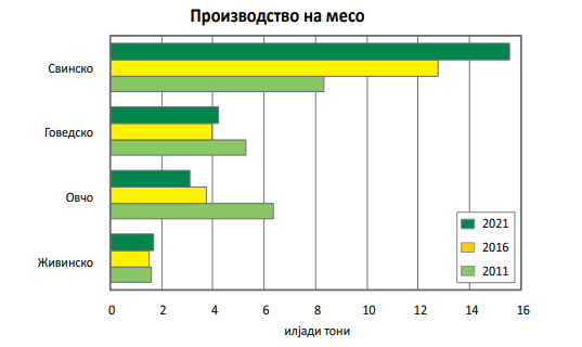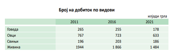 - Во 2021 година, бројот на сите видови добиток бележи опаѓање и во однос на 2011 и во однос на 2016 година. Производството на свинско месо и живинско месо е во пораст во 2021 година, споредено со претходните години, додека производството на овчо месо е во опаѓање – пишува во анализата на ДЗС.