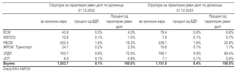 Во него може да се види, дека од позајмиците на државата, во врвот е и Развојната банка на Северна Македонија, чиј гарантиран долг достигнал до 239 милиони евра.