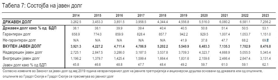 Надворешниот државен долг, на крајот на 2023 година, изнесува 4.171,0 милиони евра и во однос на 2022 година се зголеми за 187,4 милиони евра, додека внатрешниот државен долг изнесува 3.085,1 милиони евра, што претставува зголемување за 487,7 милиони евра во однос на претходната година – се појаснува во извештајот.